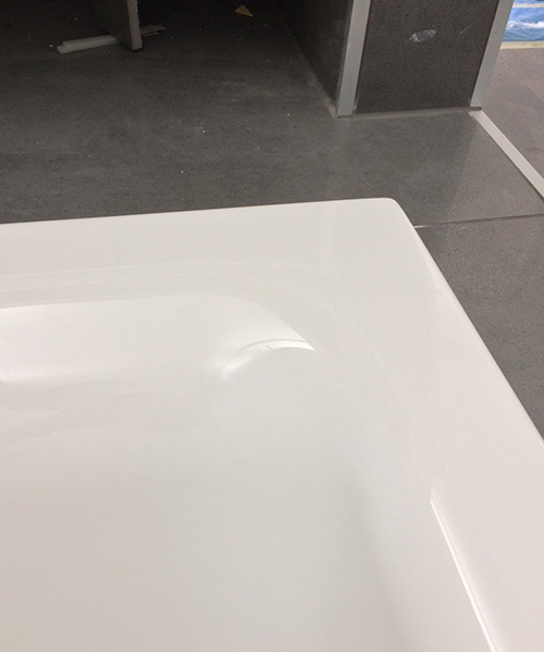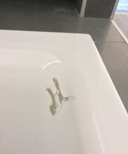 2. Installation Damage More common than you’d think – especially in new builds or renovations. During bathroom construction, tools can be dropped, other trades can accidentally impact the bath, or installation itself can cause stress cracks. Common examples include tilers accidentally chipping a bath with sharp tile edges or tools; plumbers cutting down spigot fittings, with the hot metal dropping and melting an acrylic bath surface; or trades standing in a bath in work boots with stones leaving large unsightly scratches on the bath surface.